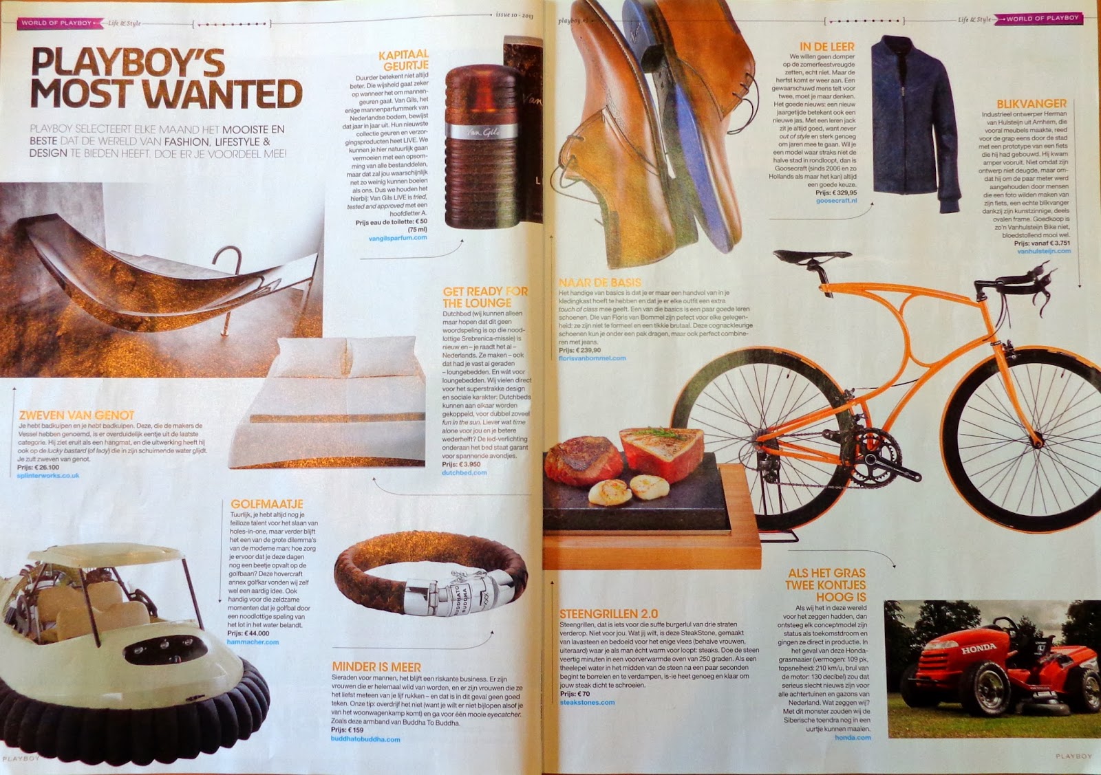 Ora, os autores da Playboy versão Holandesa, quem sabe por estarem cientes de tais falácias freudianas, ou talvez unicamente devido a questões culturais, em vez de promoverem o carro como símbolo de virilidade masculina, promovem a bicicleta. Nos artigos mais desejados pelos homens holandeses, que surgem nas páginas iniciais da revista, não vêm os carros que o Ronaldo tem na sua opípara garagem, vem antes um velocípede. Juntamente com um casaco de gama semi-alta, um bife na pedra, uma banheira com um desenho pós-moderno, uns sapatos de excelência ou um trator corta-relva, vem uma bicicleta com um quadro altamente pós-modernista para o quotidiano do metrossexual holandês. A virilidade, neste caso, em vez de se encontrar na potência do motor, está no preço, pois esta relíquia custa a módica quantia de 3751€.